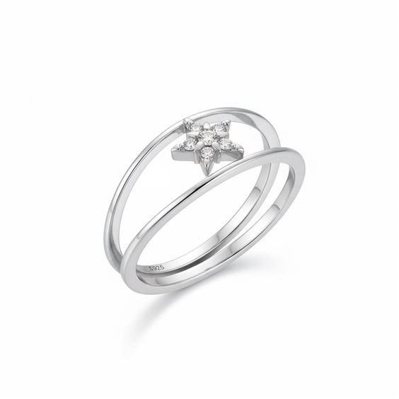 Anello in argento 925 con cristalli di zirconia cubica. Il prodotto presenta una stella con incastonate delle zirconie cubiche taglio a brillante Il gambo è liscio e risulta comodo alla calzata. Il prodotto è regolabile selezionando la misura dall'apposito box. Tutto il gioiello è stato sottoposto a palladiatura e rodiatura per renderlo splendente come l'oro bianco