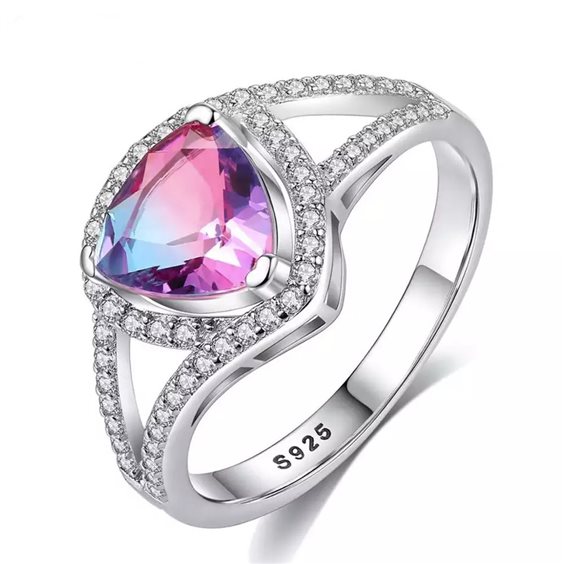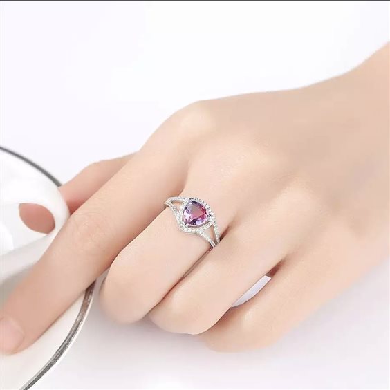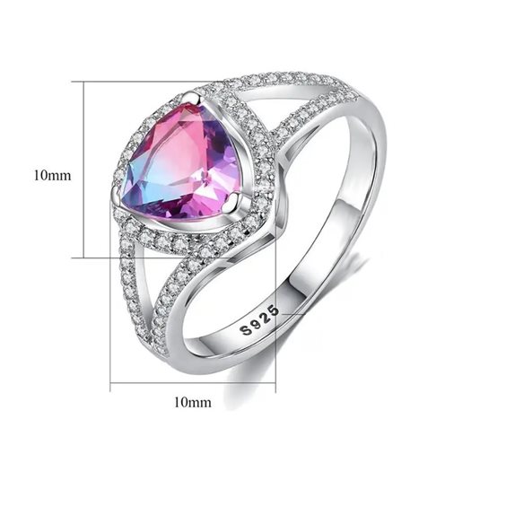 Anello Rosa Argento 925 e Zircone Colorato Anello in argento 925 rodiato. Il gioiello ha una decorazione con un importante zircone rosa, di forma triangolare, attorno cui sono incastonate delle zirconie cubiche, di taglio brillante. Anello regolabile dalla misura 8 alle 25, selezionare la misura desiderata nell'apposito box.