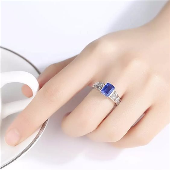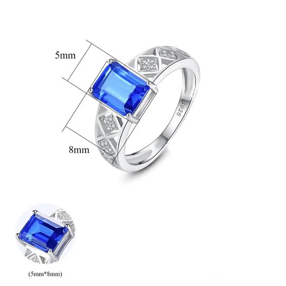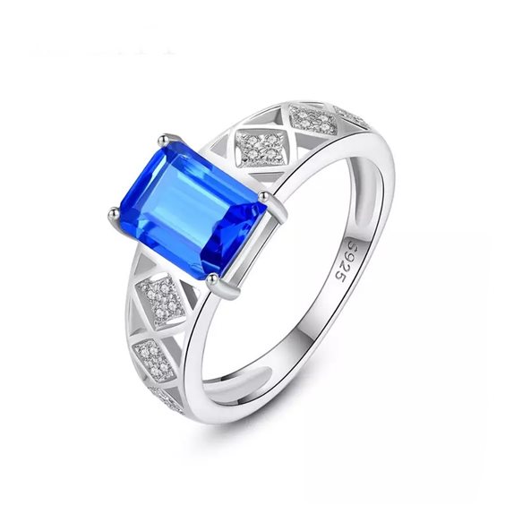 Anello in argento 925 rodiato. Il gioiello presenta una decorazione centrale di forma rettangolare con uno zircone centrale color blu intenso sul gambo a fascia a incastonate a rombo delle zirconie cubiche che garantisco tantissima brillantezza. Bellissimo da vedere indossato al dito! Il prodotto è regolabile dalla misura 6 alla 25 selezionando la misura dall'apposito box.