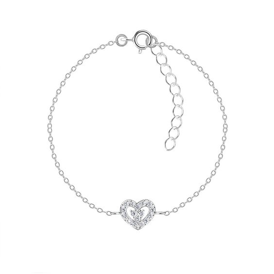 Bracciale in argento 925 rodiato. Il gioiello presenta al centro un ciondolo a forma di cuore, finemente decorato con zirconi. La catena è lunga 15 cm con un allungamento nella parte finale con catenella ad anellini sino ad arrivare a 18 cm, si può regolare la lunghezza agganciandola all’anellino desiderato. Questo gioiello è bellissimo da indossare da solo oppure abbinato ad altri bracciali della linea Luce!