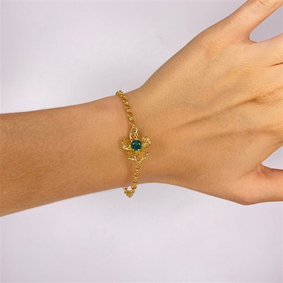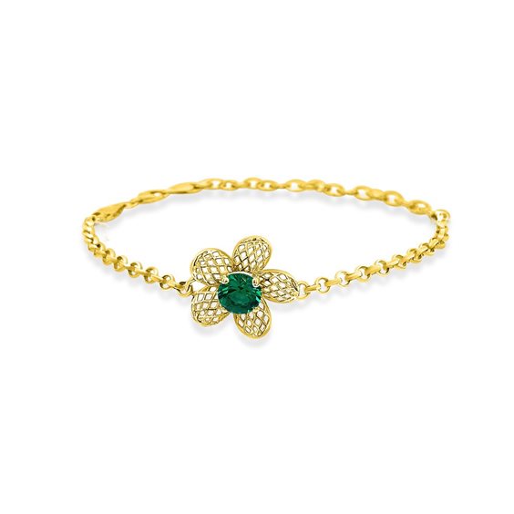 Bracciale in argento e Zircone Verde. Gioiello appartenente alla collezione Biancospino, realizzata a mano nel nostro laboratorio. Il gioiello si compone di un fiore di biancospino la cui parte centrale è composta da un punto luce colorato, mentre i petali sono dati da una rete d'argento dorato. La decorazione, nel suo complesso, ha diametro 1.50cm ; il bracciale è lungo 19.50 cm. Unico nel suo genere! Nell'eventualità la lunghezza del bracciale non fosse di vostro gradimento, contattaci e verremo incontro alle vostre esigenze. Su richiesta è possibile cambiare il colore del punto luce.