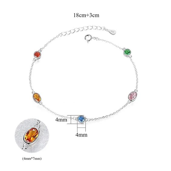 Bracciale in argento 925 rodiato. Il gioiello presenta una serie di pietre colorate di varie forme e dimensioni lungo tutta la lunghezza. La catena è lunga 40cm con un allungamento nella parte finale con catenella ad anellini sino ad arrivare a 45cm, si può regolare la lunghezza agganciandola all’anellino desiderato.