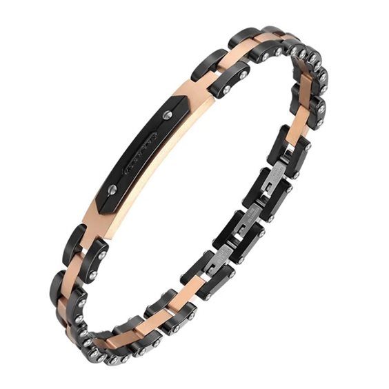 Bracciale in acciaio con targa centrale. L'elemento centrale presenta una lavorazione con spinelli neri e PVD rosato e nero. Lunghezza massima del bracciale 22 cm circa