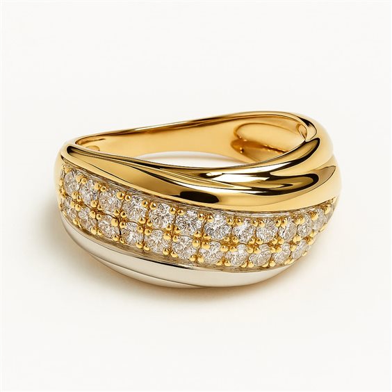 Anello da donna in oro giallo e bianco 18 kt con zirconi – 7.60 g – Idee Preziose dal 1987 – Misura 16 Un gioco di riflessi e volumi che cattura lo sguardo: questo anello in oro giallo e bianco 18 kt presenta una fascia centrale tempestata di zirconi, incastonati in tre file luminose. Le linee morbide e arrotondate conferiscono eleganza e comfort, mentre il contrasto tra i toni caldi dell’oro giallo e la brillantezza dei zirconi crea un effetto prezioso e senza tempo. Materiale: Oro 18 kt giallo e bianco Pietre: Zirconi bianchi Peso: 7.60 g Genere: Donna Stile: Fascia con pavé di zirconi Occasioni: Cerimonie, anniversari, gioiello importante Un anello che unisce luce, armonia e classe: perfetto per chi ama distinguersi con eleganza.