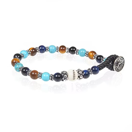 Bracciale da uomo di Gerba della collezione news. Gioiello con aulite 6mm, occhio di tigre mix 6mm, componenti in osso e metal di colore argento. Colore pietra: turchese blue e marrone. Dimensioni: 20.5cm. Chiusura bottone argento.