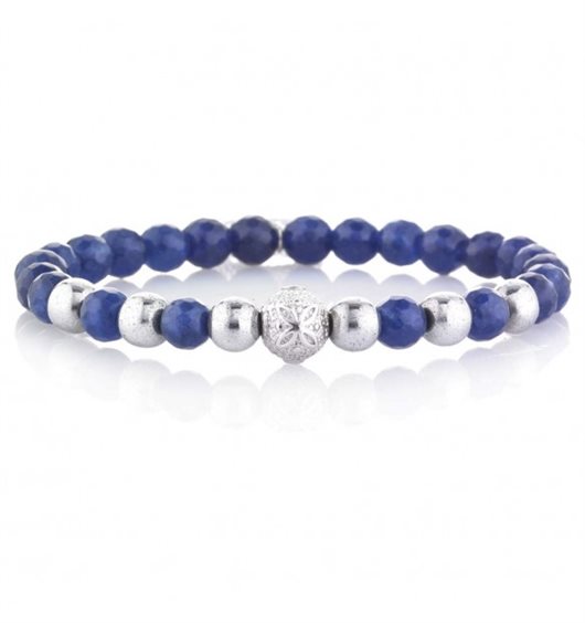 Bracciale elastico realizzato con sfere di agata blu e d'argento 925% dal diametro di 6 mm. Lunghezza massima di 17,5 cm, regolabile.