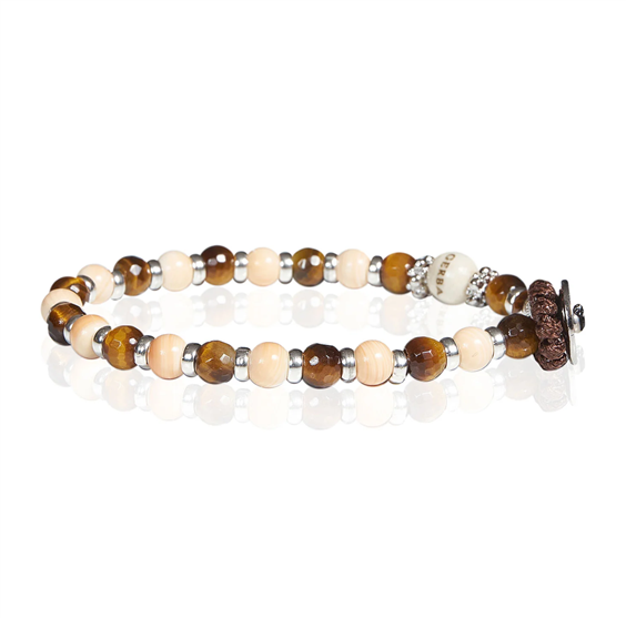 Il bracciale Gerba Muslè 03 è realizzato in argento con cordino in filo cerato, lavorazione in macramè, sfere di 6mm in Occhio di Tigre e Conchiglia e chiusura a bottone.