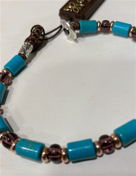 BRACCIALE GERBA UNISEX IN PASTA DI TURCHESE E VETRO DI MURANO CON CHIUSURA IN CORDONCINO MARRONE E ARGENTO 925.MISURA BRACCIALE 21 CM.