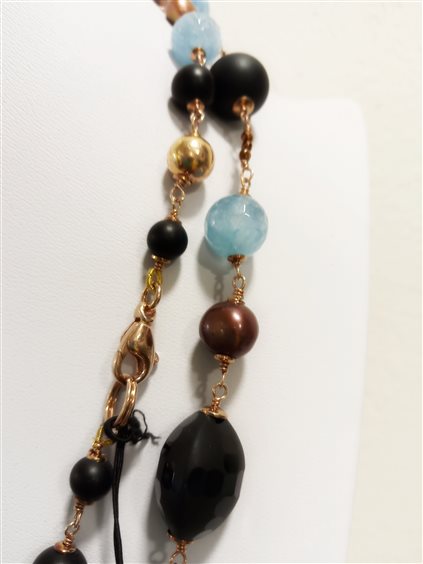 GIADAN GROUP Collana maglia rolò in argento 925 placcata oro rosé 18 kt con pietre naturali alternate: 16 boules sfaccettate di acqua marina diametro 10 mm, 6 boules in onice opaca diametro 8 mm, 5 boules in onice opaca diametro 12mm, 7 elementi a ogiva in onice opaca con motivo lucido, 14 perle barocche di acqua dolce brown. Chiusura con moschettone. Indossabile comodamente a uno o due giri, entro una certa misura indossabile anche a tre giri come choker.