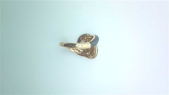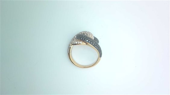Anello a forma astratta con 2 riccioli di diamanti bianchi e neri su oro rosa 18Kr