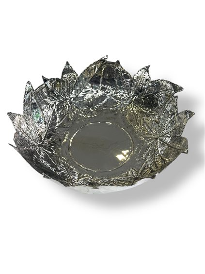 Centrotavola in argento 800, lavorazione artigianale fatta a mano. Peso grammi 237. Modello foglia marjuana Dimensioni cm 23 x 23 altezza cm 7