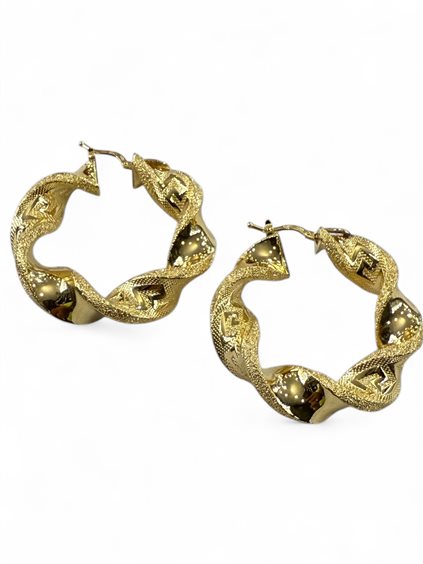 Orecchini cerchio torchon, lavorazione lucida e diamantata con greca incisa. Diametro cm 4,5