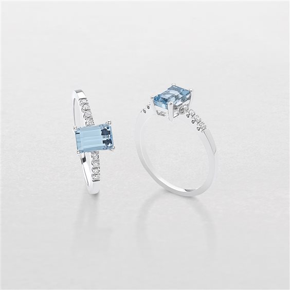 Anello in oro bianco 18 kt. della collezione Antologie con diamanti taglio brillante di kt. 0.07 F Color qualità VVS ed Acquamarina di kt. 1.24