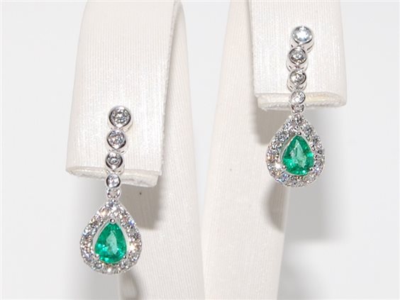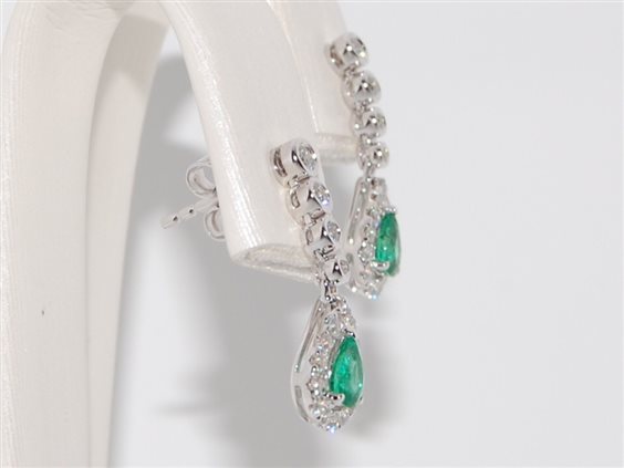 Orecchini in oro bianco 18 KT. con di diamanti a taglio brillante DI KT. 0.46 in totale e Smeraldi di kt. 0.54 in totale a forma goccia. Colore Diamanti g Purezza VS