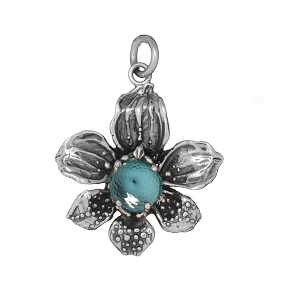 Charm Floral Ordhidea Cabochon, con quarzo idrotermale azzurro. Diametro cm.4x4 (esclusa maglina con logo cm.0,90).