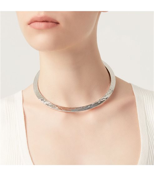 Per le donne che amano un argento di forte personalità e dal segno essenziale, ecco Blade. Connubio fra la forma più perfetta, il cerchio, ed il metallo martellato. Una collana luminosissima, per un indosso deciso.