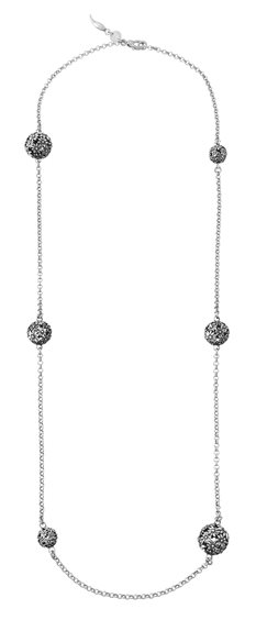 Collana lunga Margherite Shine. Una collana in argento luminosissima che fa dialogare sei boule di tre dimensioni diverse ricoperte di bellissime piccole margherite, unite da una sottile catena. Ogni singolo petalo dei fiori, realizzati in fusione a cera persa, è diamantato a mano per regalare ancora più luce al gioiello. Un capolavoro di artigianalità.