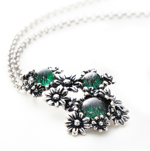 Collana Margherite Garden. Tre gemme cabochon, agata verde doppiata col quarzo tormalinato, rilucono in un prato di delicate micro-margherite d’argento brunito. Il bellissimo decoro della collana è agganciato ad una catena, sempre in argento, di 45 centimetri. Realizzato interamente a mano in azienda.