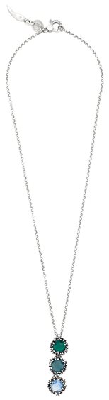 Il pendente Cascata Blue Ivy incanta con la sua raffinata armonia di colori e forme. Tre cristalli sfaccettati, rotondi e luminosi, declinati nelle tonalità del celeste, azzurro e verde smeraldo, si fondono con un delicato decoro realizzato con la tecnica della fusione a cera persa dal motivo floreale. Completa il gioiello una catena rolò in argento lunga 45 cm. Realizzato interamente a mano in azienda.