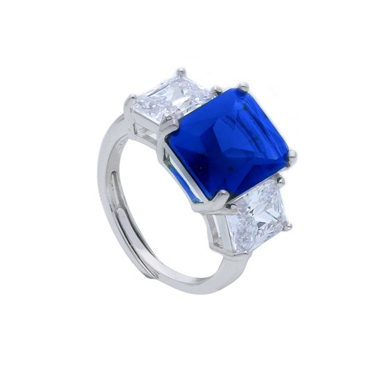 Il classico anello in argento con cristallo blu ottagonale e zirconie laterali.