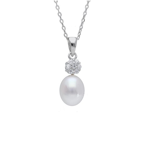 Collana con fiorellino tempestato di zirconie e perla sintetica a goccia. La misura è regolabile.