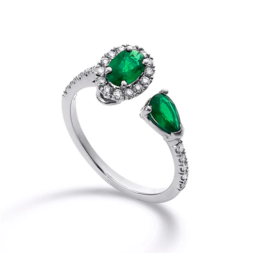 Anello in Oro 18kt Contrarier Smeraldo ovale e Smeraldo Goccia con diamanti Ct. 0,66 Taglio Diamante: Brillante Purezza Diamante: VS Colore Diamante: G Colore Metallo: Bianco Nichel Free