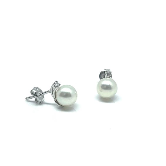 Orecchini in oro bianco 18kt con perle naturali fresh water di diametro 7-7.5 mm e diamanti naturali ct 0.04 colore G e purezza VS.