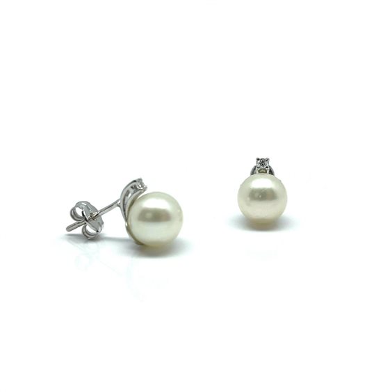 Orecchini in oro bianco 18kt con perle naturali fresh water di diametro 7.5-8 mm e diamanti naturali ct 0.04 colore G purezza VS2.