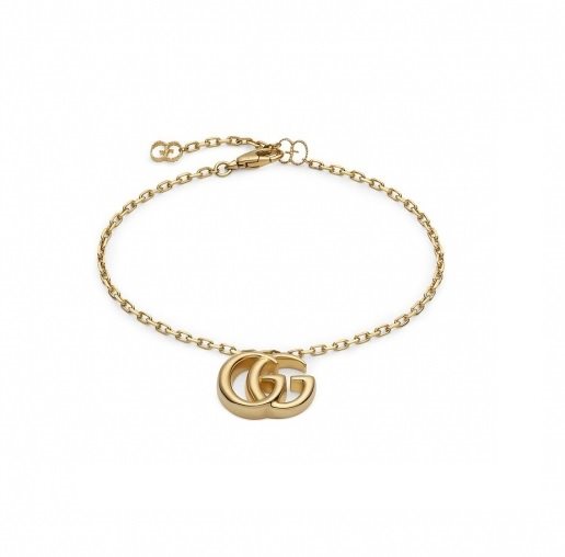 Evoluzione di un dettaglio proveniente dagli archivi Gucci degli anni '70, la Doppia G è riproposta nel ciondolo che orna questo bracciale in oro giallo 18 carati presentato nella sfilata Cruise 2018.