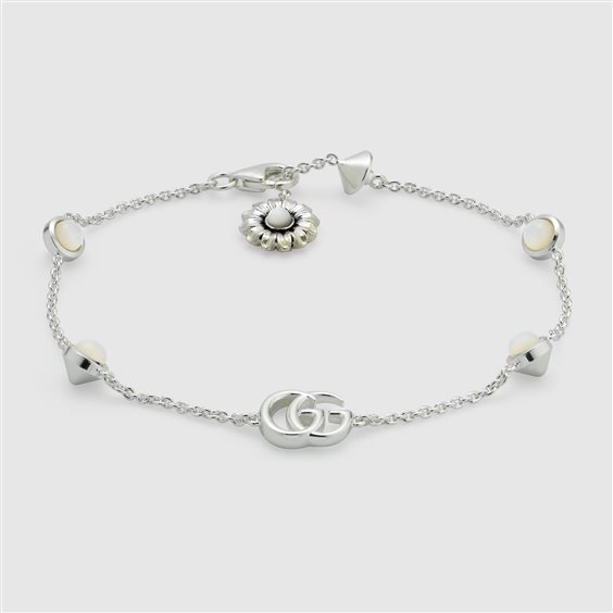 I gioielli fashion GG Marmont combinano cristalli, dettagli in perla e Doppia G come ciondoli o catene in metallo in un'intera collezione di pezzi. Questo delicato bracciale è realizzato in argento sterling ed è impreziosito da una Doppia G e dettagli in madreperla. argento 925 Ciondolo Doppia G Dettagli in madreperla per un totale di 1,18 carati Chiusura a scatto con fiore Fabbricato in Italia Gucci garantisce, al proprio interno e nella propria filiera, il rispetto degli standard di Responsabilità Sociale e Ambientale in linea con la sua strategia di sostenibilità