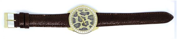 orologio solo tempo GUESS CASSA IN ACCIAIO LUCIDO IP ORO CON CRISTALLI QUADRANTE A SPECCHIO ORO CON PAVÈ DI CRISTALLI MARRONE EFFETTO ANIMALIER CINTURINO IN PELLE MARRONE,DIAMETRO CASSA 40 MM.