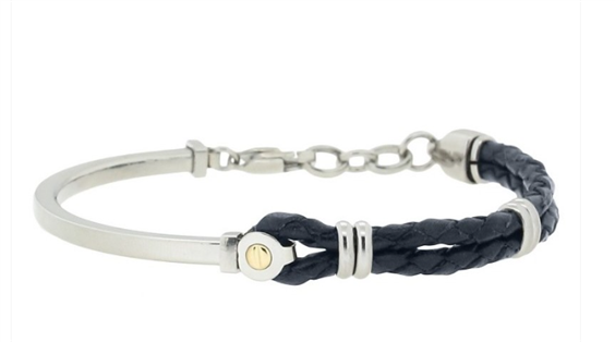 Bracciale in acciaio semirigido e cuoio blu con centrale vite in oro 18 kt (gr 0.03) DIAMETRO CM.7 REGOLABILE