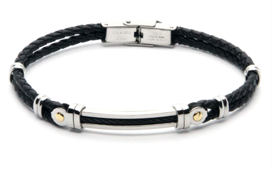 Bracciale in acciaio e cuoio nero con cavetto in acciaio PVD e oro 18 kt (gr 0.06) DIAMETRO CM.7 REGOLABILE