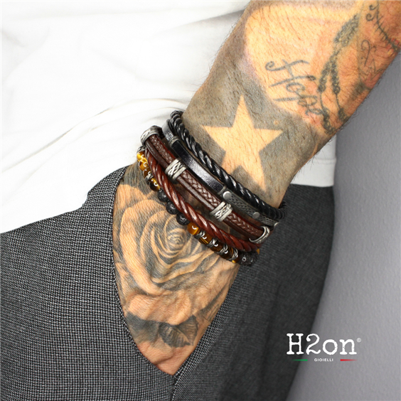 Bracciale in acciaio e cuoio marrone intrecciato e liscio con semilavorati bruniti. MATERIALE: Acciaio 316L (anallergico) CUOIO: Marrone MISURA: 21 cm LARGHEZZA: Cuoio 10 x 3 mm PESO: 19 gr I gioielli H2on sono esclusivamente di produzione italiana con misura personalizzabile, accompagnati dalla propria confezione regalo e certificato di autenticità.