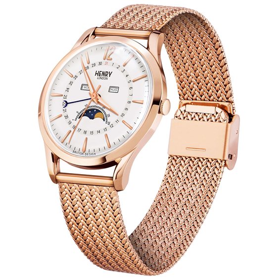 Aria vintage e tecnologia ultra contemporanea si fondono nel nuovo marchio Henry London. Il fascino discreto dell’heritage borghese segna il ritorno dello stile classico e rassicurante, giocato con l’eccentricità del colore e dei dettagli pop. Un brand giovane, eppure già stellato: appena nato si è già aggiudicato il premio “WatchPro Quartz Watch of the Year 2015” assegnato dalla rivista inglese WatchPro, per il design accurato e la sofisticata tecnologia al quarzo Myota resa accessibile a tantissimi estimatori nel mondo. Il concept del Vintage Watch di Henry London si declina in tredici modelli che ripropongono lo stile unico e raffinato di un orologio d’epoca, scovato fortuitamente a Portobello. Cuore della ricerca stilistica di ogni singolo modello Henry London, è un orologio di taglio tradizionale. Un autentico cimelio, di mirabile fattura, capace di suscitare ammirazione ed ispirazione, anche per il nome e la data di appartenenza incise sul retro della cassa “Henry, Agosto 1965” che riportava immediatamente il pensiero al bon-ton eccentrico di quegli anni. Elemento distintivo di tutte le collezioni è la cassa: tradizionale, in acciaio inossidabile lavorata a mano, anche placcata oro. Rispecchia una nuova eleganza che sfugge dall’ovvio perché ristudiata nelle proporzioni e nelle finiture come il cinturino in pelle o in maglia Milano in auge nei mitici anni ’50. Tante le varianti, uomo, donna e unisex: tutti riportano dettagli di grande tradizione come il datario e le lancette bicolore o dettagli più sportivi come il quadrante cronografo. Nei nomi, l’eco delle principali fermate della metropolitana londinese: Knightsbridge, Holborn, Highgate, Westminster, Hampstead, sono i nuovi appellativi di uno stile che propone un suo nuovo linguaggio estetico, equilibrato, elegante e mai scontato in cui sofisticati e voluttuosi blu lapislazzulo, viola ametista, verde smeraldo, rosso rubino e oro rosa si alternano al bianco e al nero. E per omaggiare l’orologio “capostipite” trovato a Portobello, i creatori hanno deciso di continuare la tradizione permettendo di personalizzare la cassa del proprio Henry London. Lo stile di Henry London è riconoscibile per il suo linguaggio sofisticato, delicatamente vintage, ma allo stesso tempo contemporaneo e all’avanguardia nelle tecnologie . Si presenta come la reinterpretazione moderna dei grandi classici. Cassa in acciaio pvd oro rosa da 38,5mm Movimento al quarzo Miyota Quadrante analogico Cronografo con fasi lunari Vetro in plexiglass antigraffio Bracciale tipo Milano in color oro rosa Quadrante Bianco