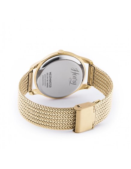 Orologio da uomo con data Questo orologio Henry London ha una cassa in acciaio inox placcato oro con un diametro di 39 mm ed è dotato di un cinturino in Metallo. All'interno ha un movimento quarzo per orologi di qualità ed è finito con un vetro di tipo plexiglass.