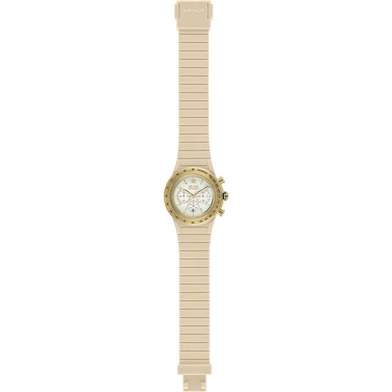 Orologio Cronografo Da Donna Di Hip Hop Della Collezione Chrono. Orologio Con Cassa Della Dimensione Di 39 Mm, Sfere Ip Gold Con Luminous E Datario. Modello Con Cinturino In Silicone Di Colore Beige Con Scala Tachimetrica Nera Su Lunetta Ip Gold Satinata. Questo Orologio Ha Movimento Pe811-6 Chrono E Resistenza All'Acqua Di 5 Atm.