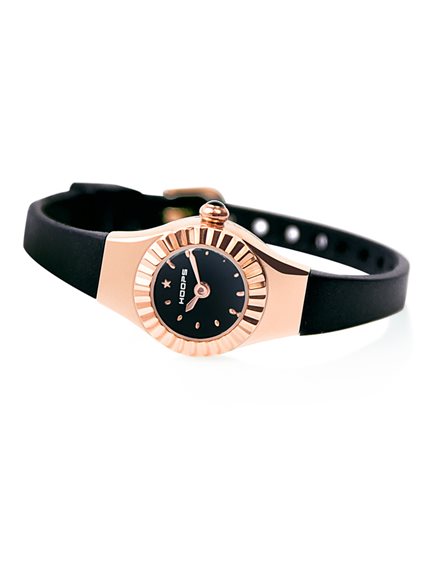 Orologio solo tempo da donna di Hoops della collezione Nouveau Tres Jolie. La cassa è in metallo con lunetta zigrinata, di colore oro e di dimensione 20 mm. Il cinturino è realizzato in silicone ed è di colore NERO. Il quadrante è di colore NERO. Il movimento è al quarzo. Funzioni: ore e minuti. La referenza è 2470L-RG07