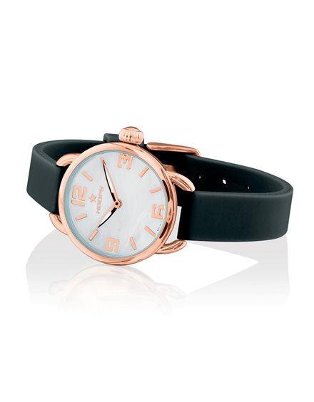 OROLOGIO HOOPS DONNA CASSA ACCIAIO PLACCATA ORO ROSA, FONDO MADRE PERLA SOLO TEMPO CON CINTURINO IN SILICONE NERO. CHIUSURA ARDIGLIONE IN ACCIAIO PLACCATO ORO ROSA.