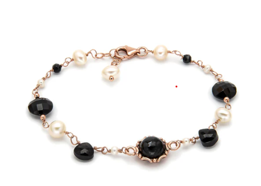 Bracciale della collezione Aurora Bracciale realizzato intrecciando a mano un susseguirsi di perle naturali e spinelli neri Centrale con cabochon di onice nero. Il bracciale misura 17 cm ed è regolabile fino a 19 cm. La chiusura è a moschettone. Realizzato in argento 925 placcato in oro giallo ad alto spessore e ad alta resistenza.