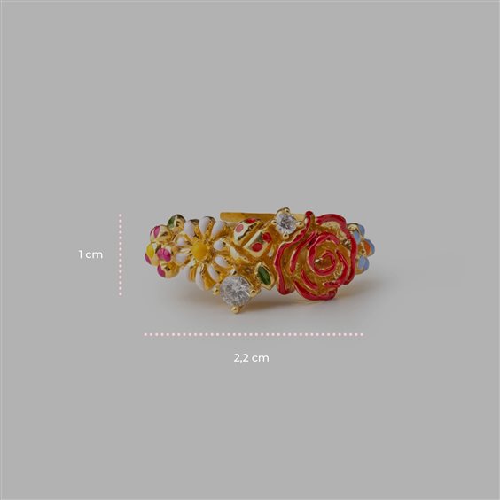 Petali delicati e colorati, un soffio di primavera, un'esplosione di colori e profumi. Lunghezza anello 2,2 centimetri, larghezza 1 centimetro, misura regolabile (Misura 15 – regolabile di ±2 misure (da 15 a 17). Per evitare danni, la regolazione deve essere effettuata esclusivamente da un gioielliere. In alternativa, specifica la misura desiderata nelle note. Anello in argento 925 placcato oro, smalti e cubic zirconia).