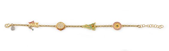 Sicilia, terra baciata dal sole, che sa brillare in questo iconico bracciale a lei dedicato, i simboli sono: trinacria, tamburello, ruota e sicilia, lunghezza bracciale 20 centimetri regolabile. Bracciale in argento sterling 925 placcato oro e smalti.