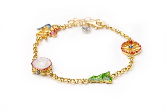 Gli iconici simboli siciliani da portare sempre con te, i simboli sono: trinacria, tamburello, ruota e sicilia, lunghezza bracciale 20 centimetri regolabile. Bracciale in argento sterling 925 placcato oro e smalti.