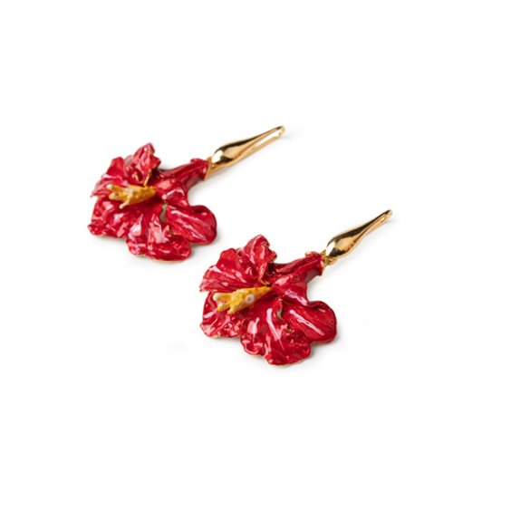 Orecchini in argento 925 placcato oro e smalti. Nel verde del giardino mediterraneo sbocciano nelle stagione più calda dei fiori dai petali grandi e colorati: sono gli Ibiscus, simbolo di bellezza. Il colore più affascinante è il rosso, ma è facile trovarne anche bianchi, fucsia, rosa e gialli.