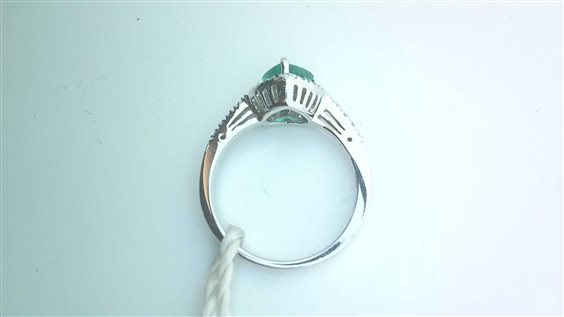 Anello in oro bianco 18Kr con smeraldo centrale tagliato a cuore e diamanti taglio brillante