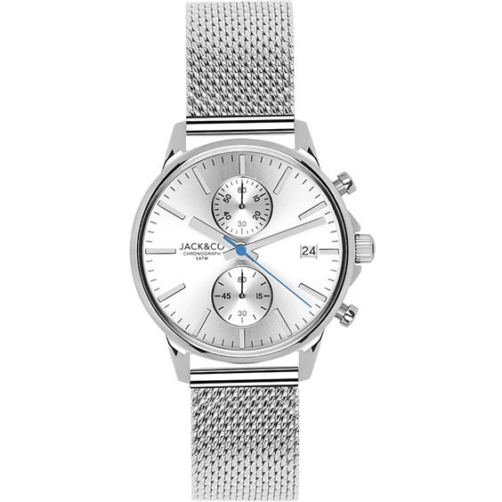 Orologio da uomo cronografo donna Jack&co Marcello. Diametro cassa 38 mm in acciaio lucido. Quadrante silver. Cronografo con Datario e bracciale mesh in acciaio lucido.