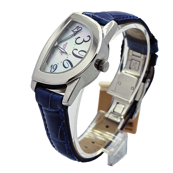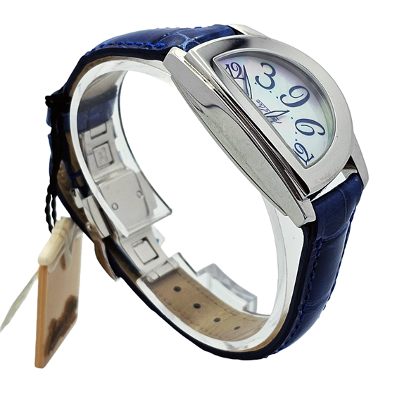 Jean d’Eve Sectana Nuova Saltarello 031360SA.AA.B è un segnatempo femminile dal design inconfondibile, pensato per chi desidera un orologio elegante, ricercato e fuori dagli schemi. La particolare cassa da 33 x 25 mm dona personalità immediata al polso, distinguendosi per linee morbide e originali che richiamano la creatività stilistica tipica della maison. Il quadrante in madreperla regala riflessi delicati e sofisticati, esaltando i numeri arabi stilizzati che contribuiscono a creare un’estetica raffinata e dinamica. L’insieme risulta armonioso, femminile e distintivo, ideale per chi cerca un orologio con forte identità visiva. Il movimento al quarzo svizzero garantisce precisione e praticità nell’utilizzo quotidiano, mentre il cinturino in pelle blu completa il modello con un tocco di carattere e di eleganza contemporanea. Un orologio che unisce stile, originalità e raffinatezza in una presenza discreta ma assolutamente riconoscibile.
