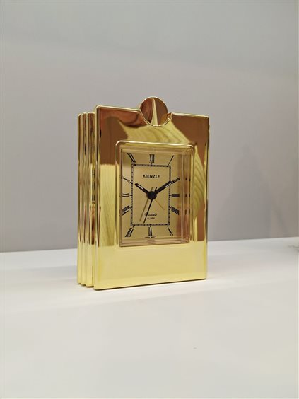 Sveglia Kienzle al quarzo in materiale plastico dorato. Altezza cm 13,50, larghezza cm 10,3 e profondità cm 3,5. Quadrante dorato con numeri romani neri stampati. Monta una pila AA, fornita all'acquisto. Scatola e istruzioni originali.
