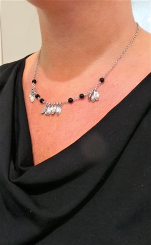 Girocollo artigianale in argento 925 rodiato e onica nero. Catena maglia rolò con fogliette zigrinate pendenti e sfere in onicenero. Misura cm 45. FATTO A MANO IN ITALIA