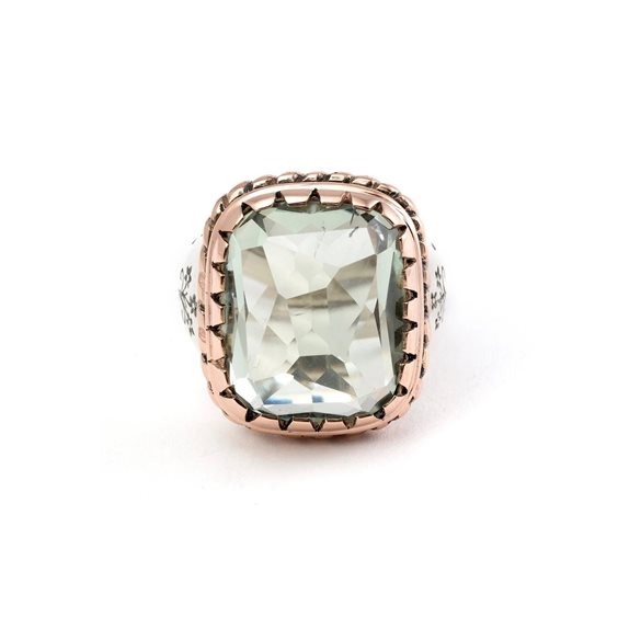 Anello in argento e oro rosa 9kt con prasiolite naturale realizzato artigianalmente misura dito 17.